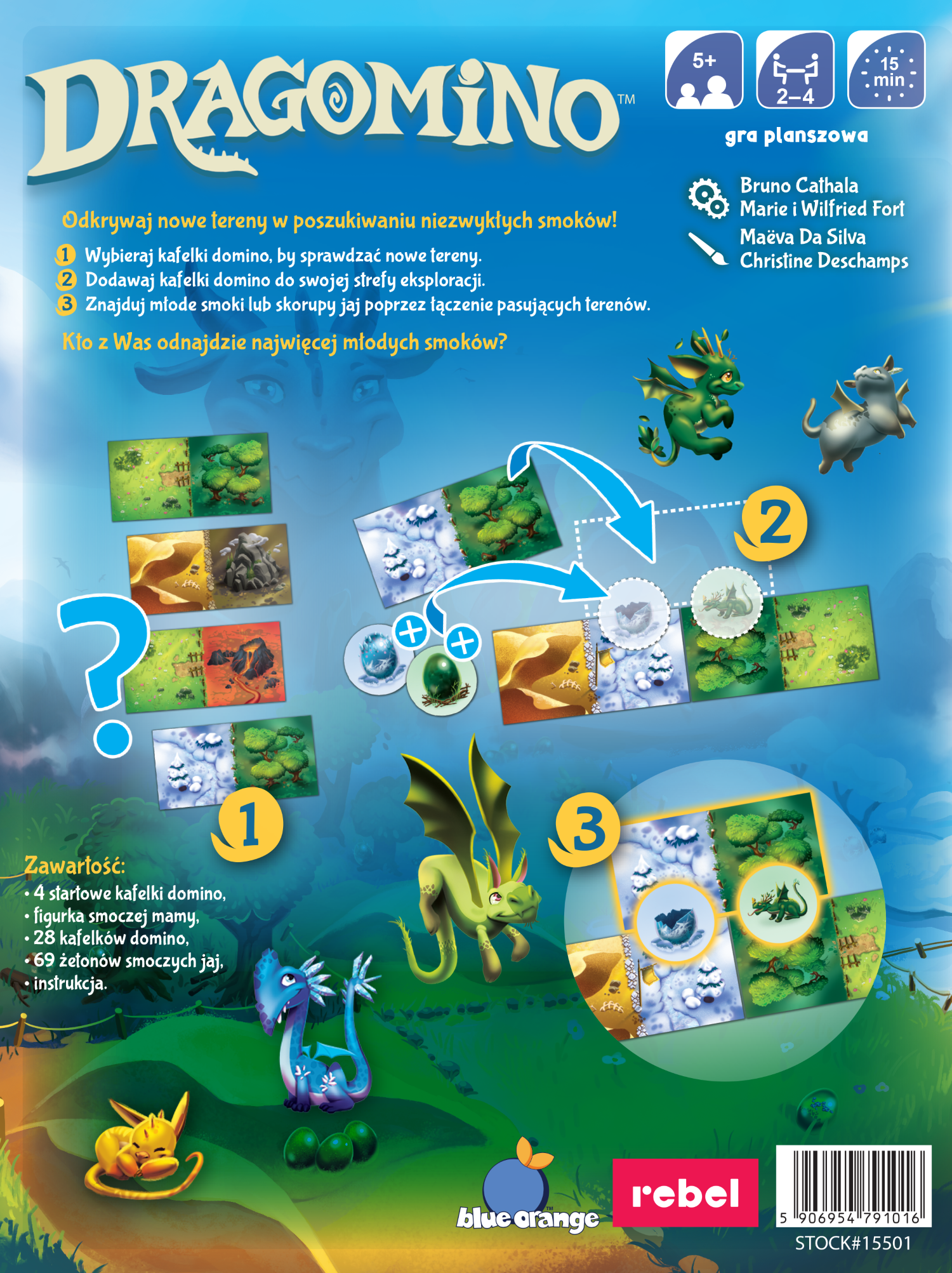 Dragomino to strategiczna gra dla całej rodziny inspirowana zasadami klasycznego domina, w pełni dostosowana do potrzeb młodszych graczy. Podczas zabawy będziemy dobierali kolejne kafelki terenów i umieszczali je w swoich strefach eksploracji. Grupowanie terenów tego samego rodzaju pozwoli nam na zdobywanie żetonów smoczych jaj. W niektórych kryją się wyjątkowe okazy!