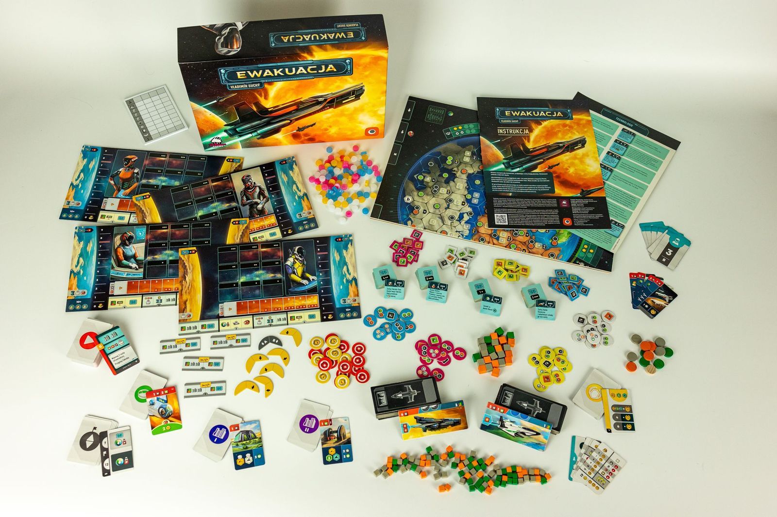 Ewakuacja to nowa strategiczna gra Vladmira Suchego, w której gracze będą zarządzać ekonomią i produkcją na 2 planetach jednocześnie, koordynując transport pomiędzy innymi na pokładzie statków kosmicznych. W trakcie gry gracze będą balansować działaniami na obu planetach - produkcją, przenoszeniem fabryk między planszami, zasiedlaniem nowego świata, jednocześnie rozwijając nowe ekonomie i starać się wykonywać optymalną ilość akcji w trakcie rundy. Dodatkowo gra zawiera warianty eksponujące nowe oblicza gry, a także tryb solo.