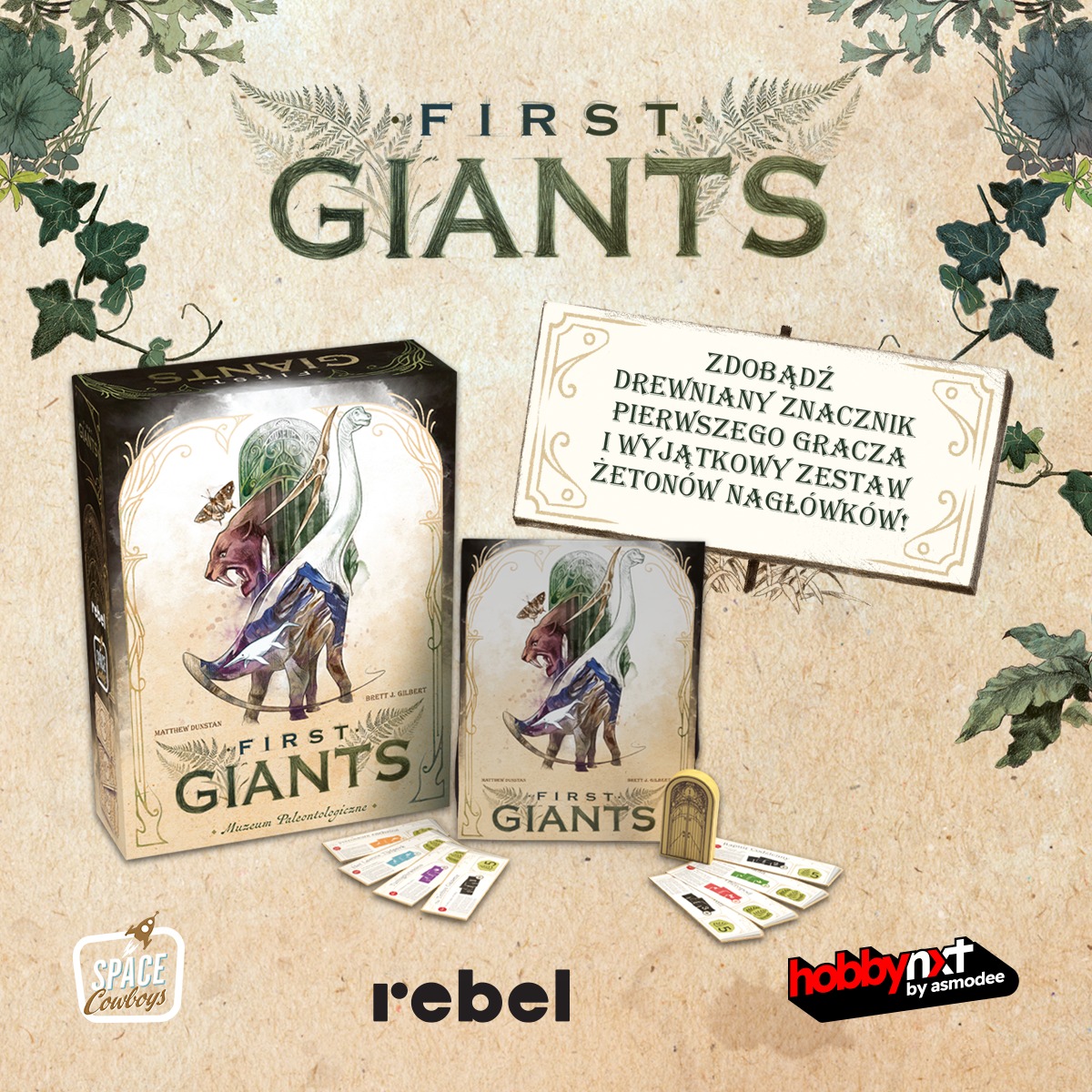 First Giants: Muzeum paleontologiczne to strategiczna gra karciana, która sprawnie łączy zbieranie zestawów i sprytne wykorzystywanie dostępnych efektów. Podczas zabawy staramy się jak najlepiej skomponować wystawę ze zgromadzonych skamielin dinozaurów, latających gadów i ogromnych ssaków. Gdy dodajemy kartę do obszaru badań, możemy skorzystać z jej zdolności, a nawet stworzyć wartościową kombinację z efektów różnych kart. Jednak dopiero eksponowanie odkryć w odpowiednich zestawach zapewnia nam punkty, dzięki czemu wyczucie czasu będzie kluczowe dla naszych ostatecznych wyników.