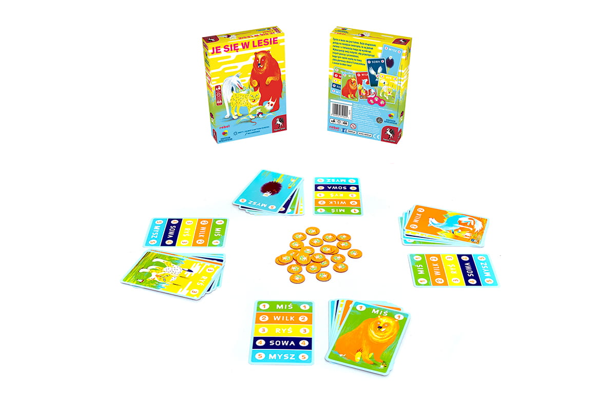 Je się w lesie to prosta gra karciana, w której starasz się skutecznie zapolować, a przy tym samemu nie stać się zwierzyną. Do dyspozycji masz zestaw zwierzaków: misia, wilka, rysia, sowę oraz mysz. Zgodnie z regułami rządzącymi przyrodą, duże drapieżniki polują na mniejsze zwierzęta, te są jednak zwinne i z łatwością mogą się wymknąć. Wykorzystaj swój instynkt, aby przechytrzyć innych graczy i przewidzieć, kogo tym razem wyślą na łowy. Jako pierwszy zbierz 5 znaczników i zostań królem lasu!