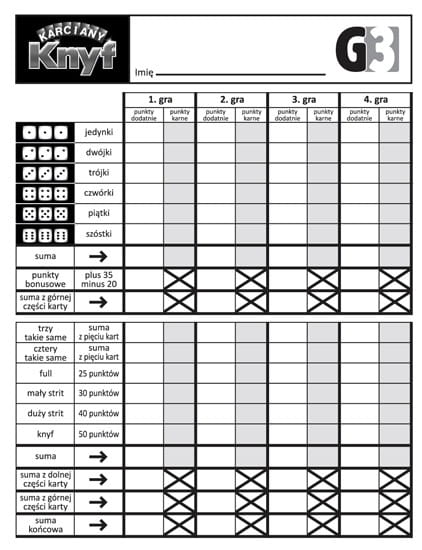 W Knyfie Karcianym znajdziemy talię 108 kart umożliwiającą rozgrywkę w klasyczną grę w kości. Są tu full, strit, trójki i inne znane układy. Należy znaleźć je wszystkie szybciej niż pozostali gracze.