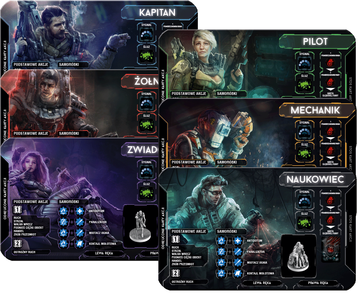 - 6 figurek postaci (Kapitan, Pilot, Naukowiec, Zwiadowca, Żołnierz, Mechanik)