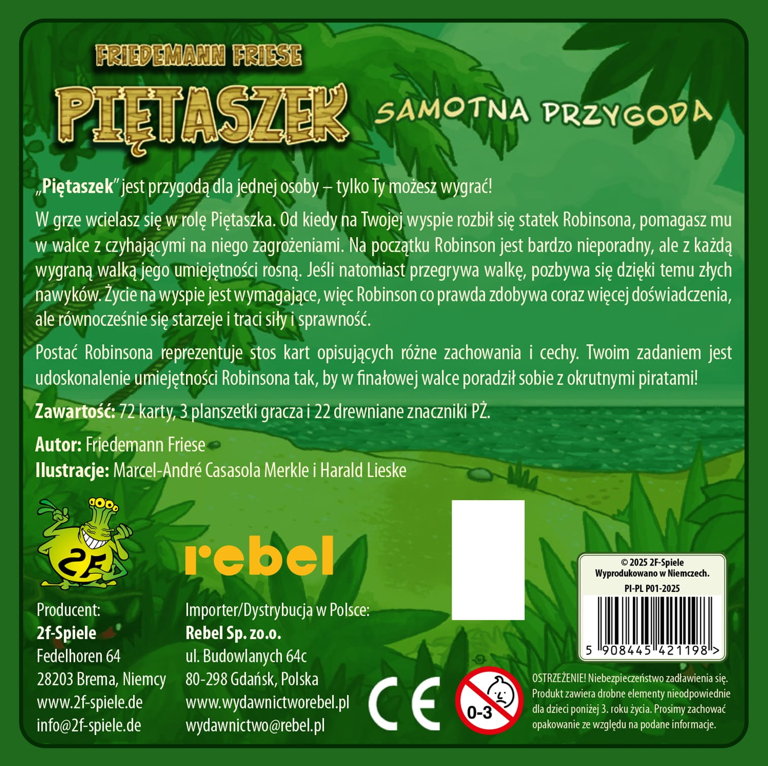Piętaszek to jednoosobowa gra karciana oparta na skutecznym budowaniu talii, w której wcielasz się w tytułowego mieszkańca bezludnej (jak dotąd) wyspy. Twoim zadaniem jest pomóc Robinsonowi w walce z czyhającymi na niego zagrożeniami. Na początku rozbitek jest bardzo nieporadny, ale z każdą wygraną walką jego umiejętności rosną. Porażki też pozwalają mu się rozwijać – to świetna okazja, by pozbyć się złych nawyków! Musisz więc mądrze prowadzić go przez kolejne wyzwania, trafnie oceniając, kiedy warto stanąć do walki, a kiedy lepiej sobie odpuścić.