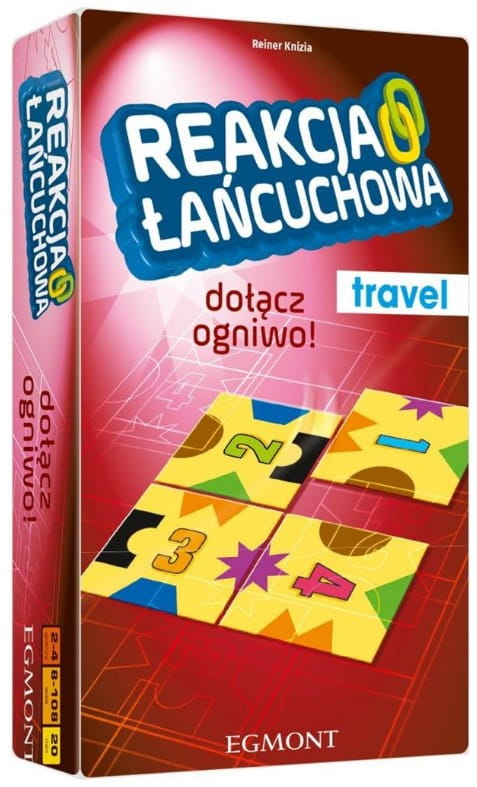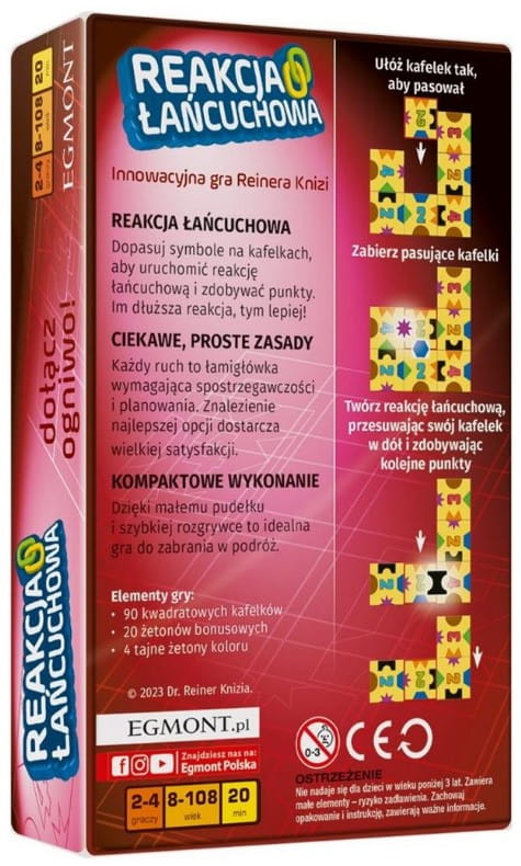 Dopasuj do siebie symbole na kafelkach, aby uruchomić reakcję łańcuchową i zdobywać punkty. Im dłuższa reakcja, tym lepiej! Reakcja łańcuchowa to łamigłówka wymagająca spostrzegawczości i planowania. Znalezienie najlepszej opcji dostarcza wielkiej satysfakcji. Dzięki małemu pudełku i szybkiej rozgrywce to idealna gra do zabrania w podróż.