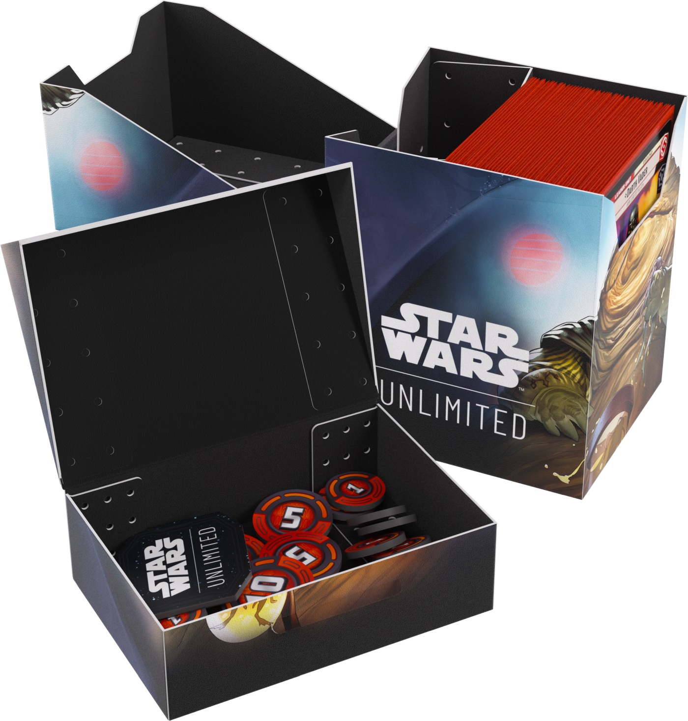 Gamegenic Star Wars: Unlimited Soft Crate to pudełko składające się z dwóch szufladek, przeznaczonych do noszenie podwójne zakoszulkowanej talii (maksymalnie 60 kart) i przechowywania żetonów. Pudełko jest także wyposażone w bezpieczny mechanizm zatrzaskowy, który chroni przed przypadkowym otwarciem, a jednocześnie umożliwia łatwy dostęp do talii. Każde pudełko dekoruje unikalna grafika, nawiązująca do bogatej historii uniwersum Gwiezdnych wojen.