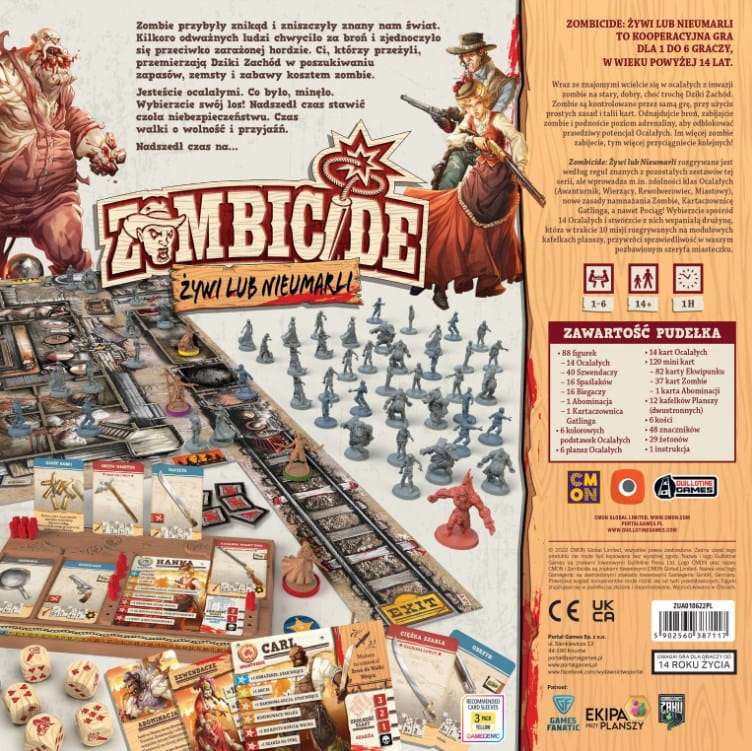 Świeże podejście do serii Zombicide - Hitowa gra planszowa powraca, wymyślona na nowo w scenerii westernu! Usprawnione zasady, różne klasy, nowi ocaleni i zombie! Nowe mechaniki na usługach klimatu i grywalności Odświeżona mechanika hałasu, usprawnione rozstawienie, brak drzwi, wyzwania dla graczy, ulubione bronie - to tylko niektóre z innowacji tej odsłony.